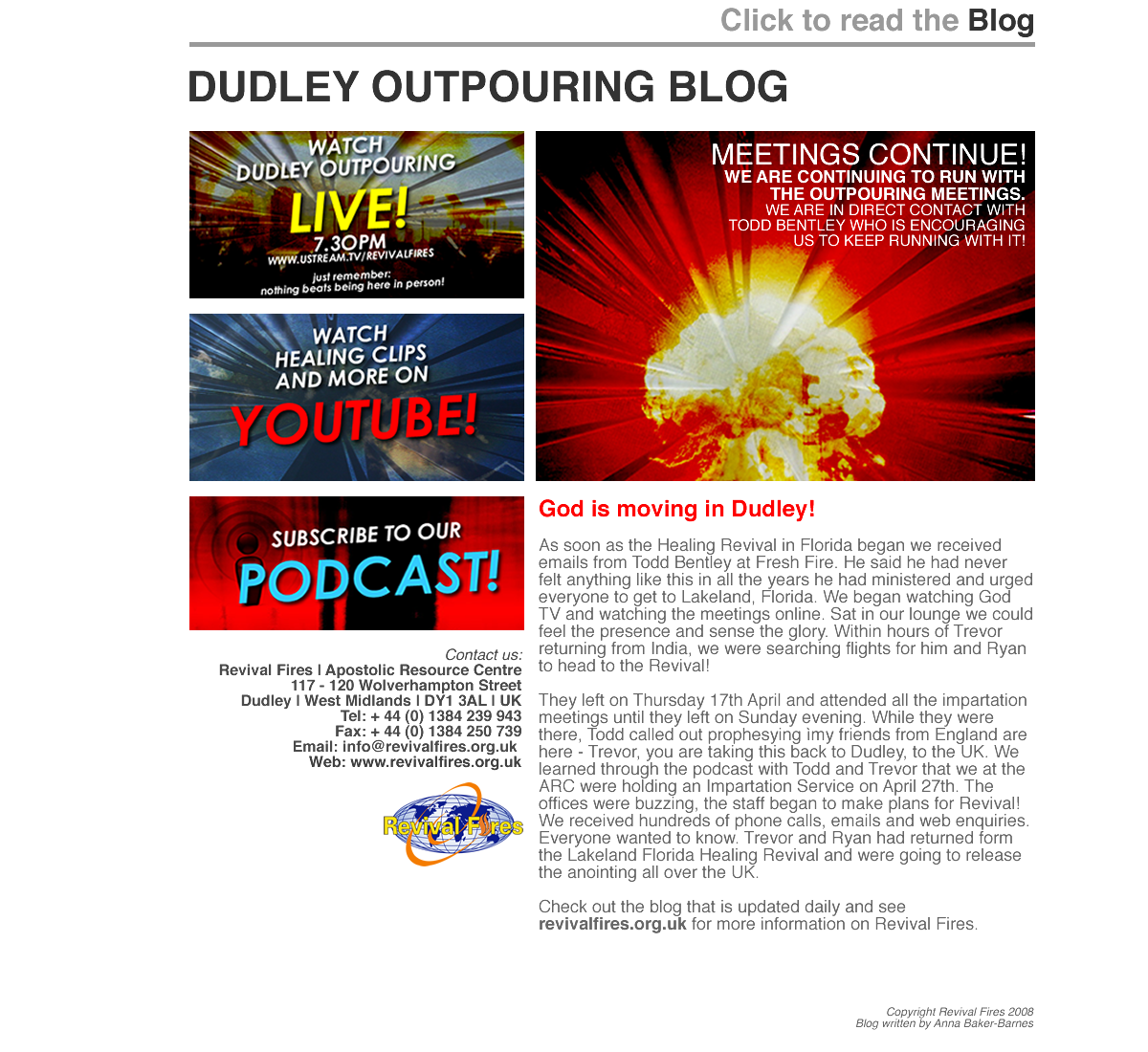 Visit Revival Fires website Subscribe for FREE FirePods Watch healing clips Watch the Dudley Outpouring LIVE! Read the Dudley Outpouring Blog